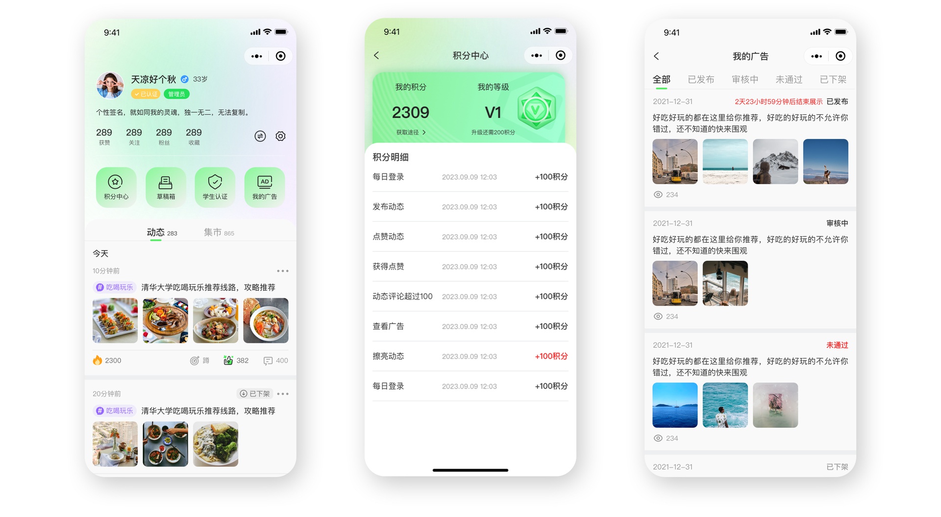 積分模塊點(diǎn)擊,可以看到個(gè)人的積分和等級(jí),以及每日登錄、發(fā)布動(dòng)態(tài)、點(diǎn)贊、獲得點(diǎn)贊、擦亮動(dòng)態(tài)、查看廣告、每日登錄等。